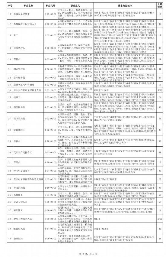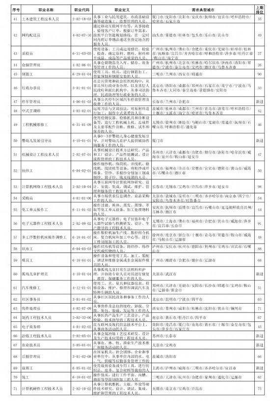 人社部指出,在疫情防控常态化条件下,社会管理和社会服务事业人才需求加大。 “保卫管理员”“保安员”“社区事务员”等职业排位上升。“家政服务员”位列前十,“保育员”“养老护理员”排位上升,“婴幼儿发展引导员”“孤残儿童护理员”首次进入排行,“幼儿教育教师”重新进入排行,“中学教育教师”排位上升。