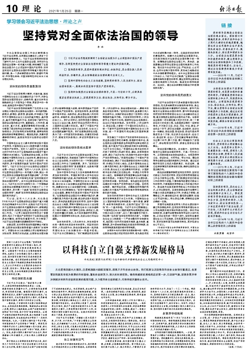 依法治国关键在党。在实践中,坚持和加强党对全面依法治国的领导,不是一句空的口号,必须具体落实在党依法执政上,实现党领导立法、保证执法、支持司法、带头守法,健全党领导全面依法治国的制度和工作机制,通过法定程序使党的主张成为国家意志、形成法律,通过法律保障党的政策有效实施,确保全面依法治国正确方向。