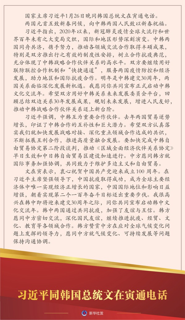 新华社北京1月26日电 国家主席习近平1月26日晚同韩国总统文在寅通电话。