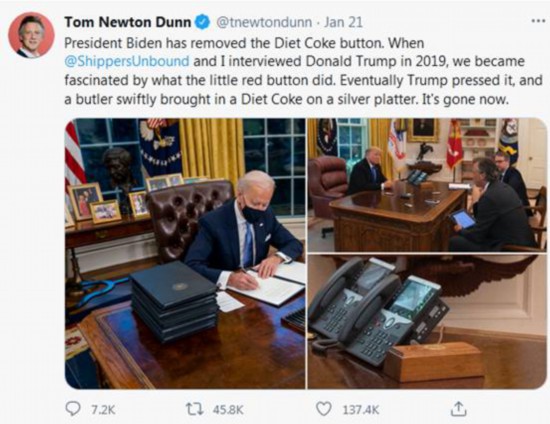 但在拜登就任第一天发布的照片中,这个“红色按钮”并没有出现。《纽约时报》记者汤姆·邓恩21日也发推称这一按钮被拿走了,他还配上了特朗普和拜登办公桌的对比照片。
