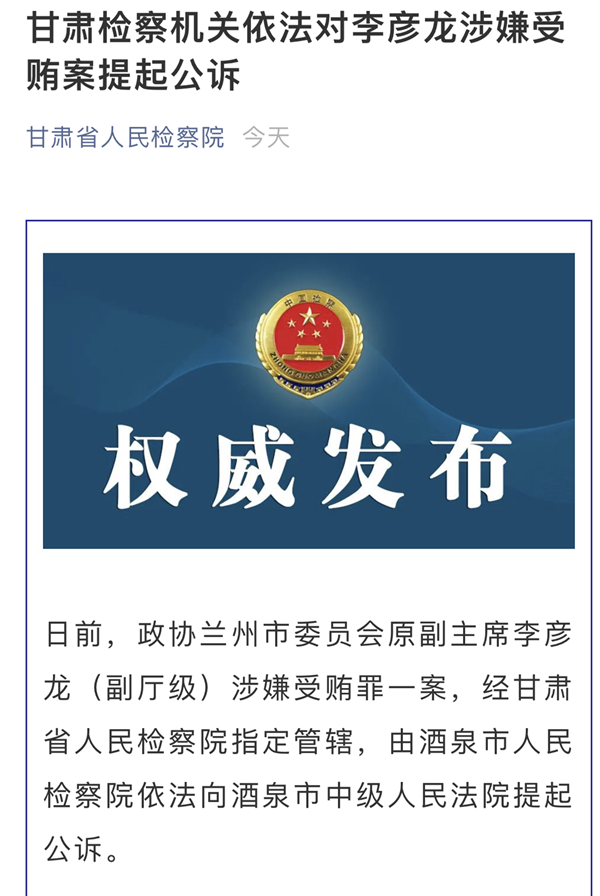 荔枝新闻讯 1月27日,据甘肃省人民检察院微信公号,日前,政协兰州市委员会原副主席李彦龙(副厅级)涉嫌受贿罪一案,经甘肃省人民检察院指定管辖,由酒泉市人民检察院依法向酒泉市中级人民法院提起公诉。