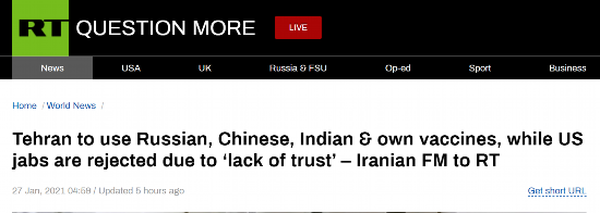 【环球网报道】正在莫斯科访问的伊朗外长扎里夫在接受“今日俄罗斯”(RT)电视台节目采访时直言,伊朗将使用俄罗斯、中国和印度制造的新冠疫苗,但由于公共卫生和政治因素,伊朗不会使用美国疫苗。报道称,这档节目将于周四播出。