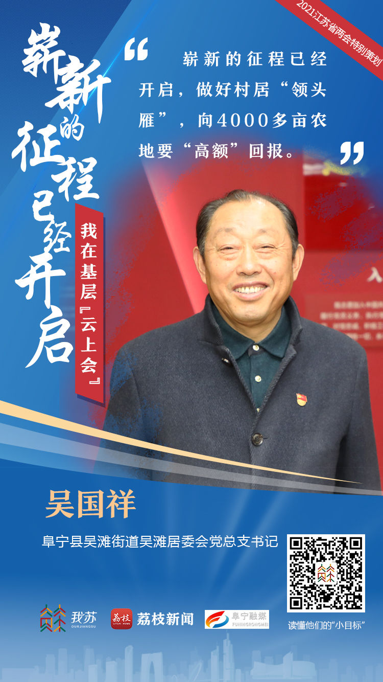 “政府工作报告用数据说话,震撼人心,让我备受鼓舞;‘十四五’规划,起点高,任务重,作为一名村居‘领头雁’,我要牢固树立带领全居致富意识,敢想、敢干、敢试、敢闯,集中精力把经济搞上去。向全居4000多亩农地要‘高额’回报,将群众土地的流转年租金增长为1800元/亩,为群众增收;下决心挖掘闲置资产,关闭环保不达标的小浴室、小饭店、小作坊,通过改造提升,重新招租,将年租金上升至100万元;加大卫生健康体系和养老服务体系建设投资力度,新建生态健身公园、免费3D电影院、多功能文化活动中心、老年居家养老院等,让集体发展的红利惠及到全居群众。”——吴国祥