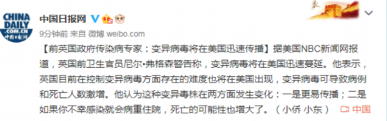 据美国NBC新闻网报道,英国前卫生官员尼尔 弗格森警告称,变异病毒将在美国迅速蔓延。他表示,英国目前在控制变异病毒方面存在的难度也将在美国出现,变异病毒可导致病例和死亡人数激增。他认为这种变异毒株在两方面发生变化:一是更易传播;二是如果你不幸感染就会病重住院,死亡的可能性也增大了。