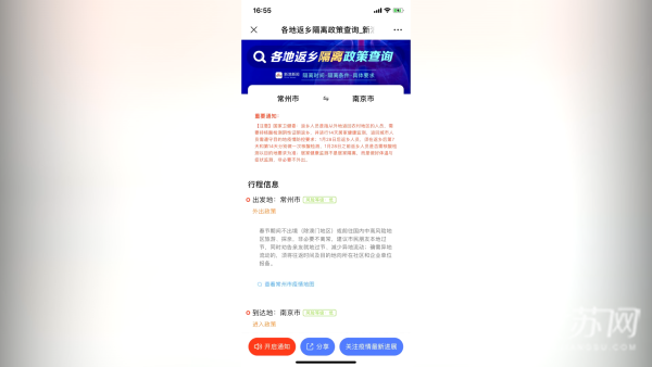 江苏各市还对返苏人员,出台了健康管理细则。如南京、南通、常州、连云港等地对入境人员实施了"14+14"健康管理措施,对冷链等高风险行业返乡人员,开展了居家健康监测;中高风险地区返乡人员开展居家观察管理等。市民们可以使用"各地返乡隔离政策查询"功能,查询具体地区隔离政策。