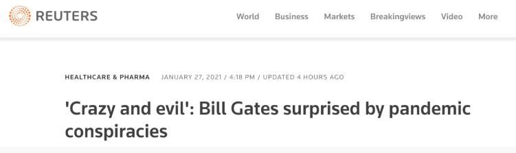 【环球网报道 记者 边子豪】“人们真的相信这些东西吗?” 当地时间27日,美国微软公司创始人比尔·盖茨接受路透社采访,面对阴谋论他这样说道。采访中,比尔·盖茨表示自己在社交媒体上被“疯狂”而“邪恶”的阴谋论攻击,同时提到他想要探寻这种攻击的背后是什么。
