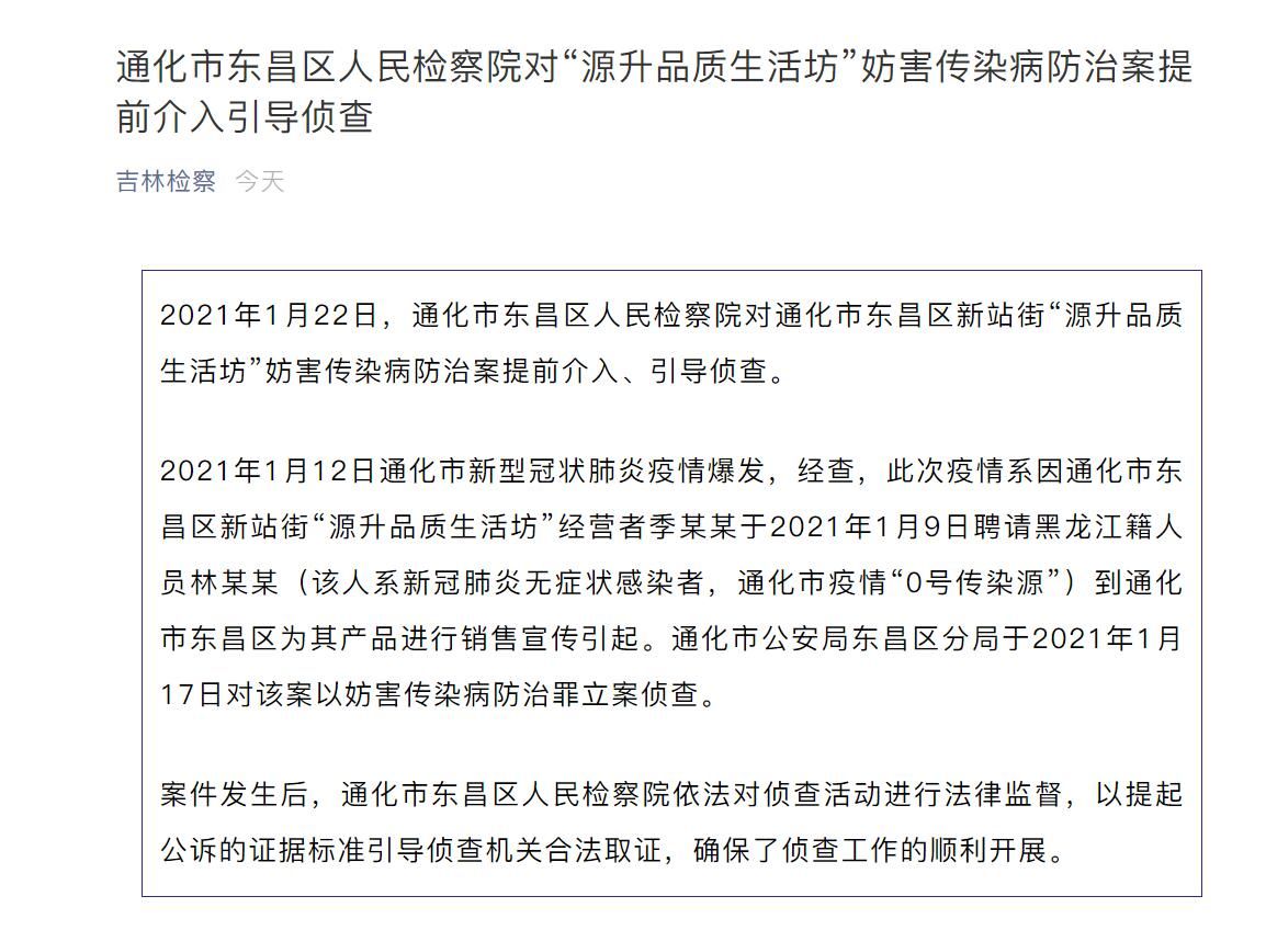 荔枝新闻讯 据“吉林检察”微信公众号消息,2021年1月22日,通化市东昌区人民检察院对通化市东昌区新站街“源升品质生活坊”妨害传染病防治案提前介入、引导侦查。