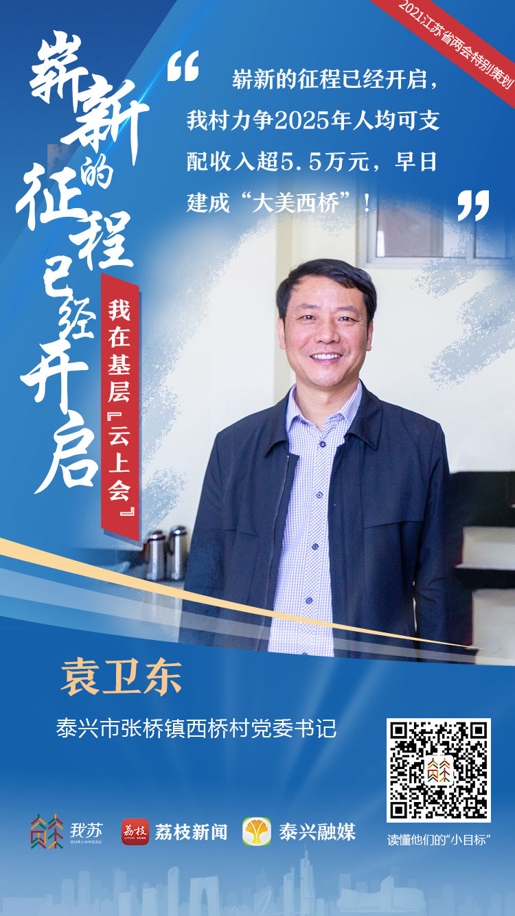 “娄勤俭书记在讲话中指出,大力推动社会治理重心向基层下移,加快省域社会治理现代化。政府工作报告中也提到,坚持尽力而为、量力而行,持续加大民生投入,着力保障和改善民生。我作为一个基层村党委书记对此深有感触,新的阶段,一定积极团结村两委会一班人,带领全体党员干部,围绕经济发展新台阶、基层治理新模式、民生改善新跨越、党群建设新活力四个方面,争取2022年创成‘全国文明村’,力争2025年村集体经营性收入超400万元,农民人均可支配收入超5.5万元,早日建成‘大美西桥’,高质量完成我村‘十四五’规划。”——袁卫东