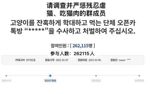 目前,涉事聊天群的群主已经把虐待动物的内容全部删除,并解散了该群。但是,该事件的关注度却持续上升。随着争议的扩散,有民众向青瓦台请愿,要求调查并严惩施虐者。截至本月25日,已有26万2115人参与请愿。