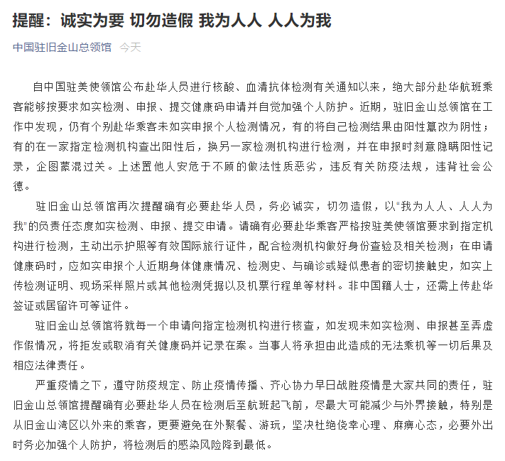 自中国驻美使领馆公布赴华人员进行核酸、血清抗体检测有关通知以来,绝大部分赴华航班乘客能够按要求如实检测、申报、提交健康码申请并自觉加强个人防护。近期,驻旧金山总领馆在工作中发现,仍有个别赴华乘客未如实申报个人检测情况,有的将自己检测结果由阳性篡改为阴性;有的在一家指定检测机构查出阳性后,换另一家检测机构进行检测,并在申报时刻意隐瞒阳性记录,企图蒙混过关。上述置他人安危于不顾的做法性质恶劣,违反有关防疫法规,违背社会公德。