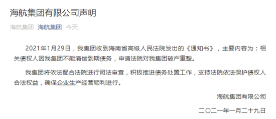 荔枝新闻讯 海航集团微信公众号消息:2021年1月29日,我集团收到海南省高级人民法院发出的《通知书》,主要内容为:相关债权人因我集团不能清偿到期债务,申请法院对我集团破产重整。