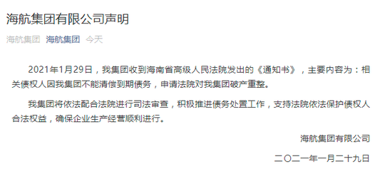荔枝新闻讯 据“海航集团”微信公众号消息,2021年1月29日,我集团收到海南省高级人民法院发出的《通知书》,主要内容为:相关债权人因我集团不能清偿到期债务,申请法院对我集团破产重整。