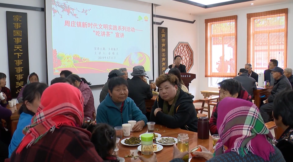 以茶为载体,通过吃茶的形式,村民们聚在一起,谈笑风生、交流社会商业信息和生产生活中的大小事,有时处理家庭和社会中难解决的矛盾。苏州昆山市融媒体中心选送的周庄故事中,“吃讲茶”历史悠久,将“吃讲茶”与新时代文明实践相结合,周庄镇给民间的这种聊天方式赋予了新的要求和内涵,陆续组建了以老党员、老干部、老模范、“田秀才”、大学生村官、基层干部为主要力量的“新时代文明实践理论政策宣讲志愿服务”队伍,有针对性地推动工作。