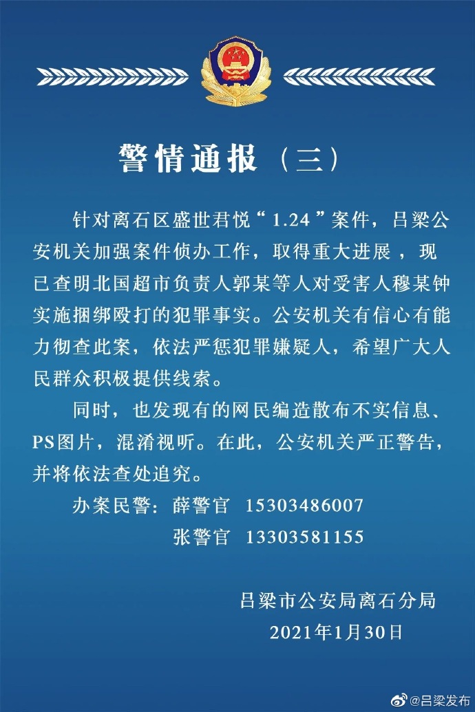 荔枝新闻讯 @吕梁发布消息,1月30日通报,针对离石区盛世君悦“1·24”案件,吕梁公安机关加强案件侦办工作,取得重大进展,现已查明北国超市负责人郭某等人对受害人穆某钟实施捆绑殴打的犯罪事实。