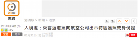 [环球网综合报道 记者赵友平]香港“东网”1月31日消息称,港人今日(31日)起若持英国国民(海外)(BNO)护照,不能在香港出入境。香港入境处已就相关措施向香港国际机场航空公司委员会发出通知,当乘客登机返回香港时,航空公司需要求相关香港居民出示其香港特区护照或香港永久性居民身份证,以作证明。