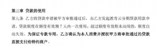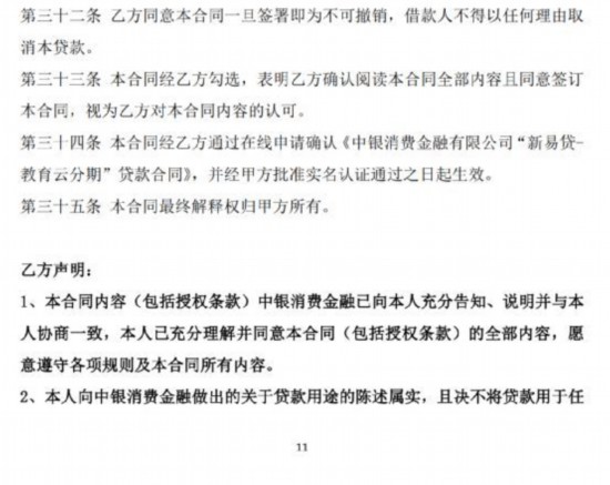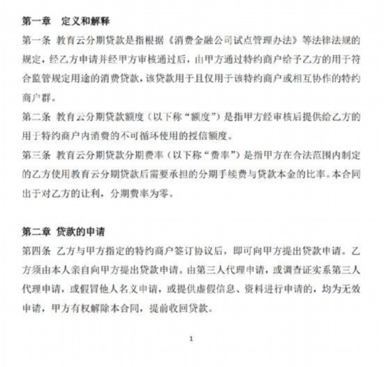 记者拿到的一份中银消费金融“新易贷-教育云分期”贷款合同显示,消费者与中银消费金融指定的特约商户签订协议后,即可提出贷款申请。