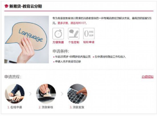 以中银消费金融为例,中银消费金融官网显示,新易贷-教育云分期是“专为有语言教育培训需求的消费者提供的一种专属消费信贷解决方案。”