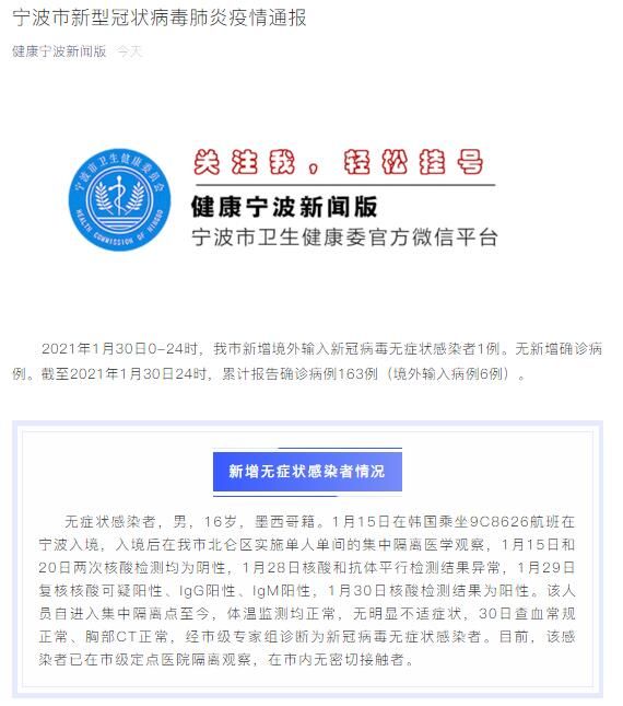 荔枝新闻讯 31日,浙江省宁波市卫生和计划生育委员会微信公众号“健康宁波新闻版”通报,2021年1月30日0-24时,该市新增境外输入新冠病毒无症状感染者1例。无新增确诊病例。截至2021年1月30日24时,累计报告确诊病例163例(境外输入病例6例)。