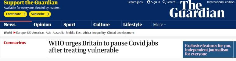 《卫报》:世界卫生组织敦促英国在给新冠易感人群接种后暂停疫苗接种
