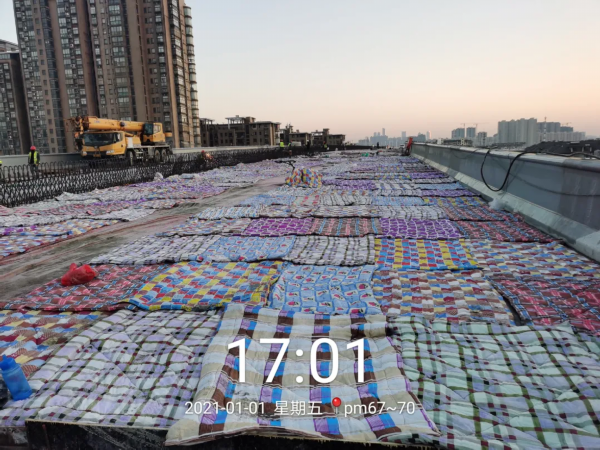 对此,项目部采用提高混凝土标号的方法增强防冻能力,同时给桥面盖上棉被“保暖”,提高温度,保质保量完成建设任务。