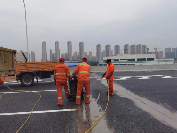 工人同时在进行伸缩缝切缝施工,提升工程施工效率,与时间赛跑,确保早日完工。