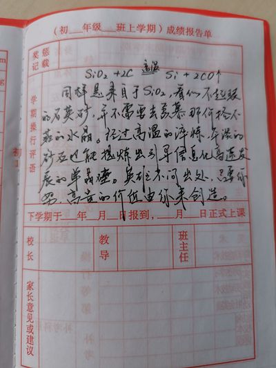 看着这一对“好姐妹”共同进步,薛磊显得十分开心。在期末评语中,薛磊以“氢与氧化铜”为例,在性质活泼的氢气带动下,黑色的氧化铜也能显现出光亮的红色。