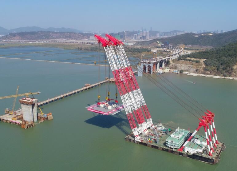 1月31日下午5点18分,随着3600吨海鸥号起重船将重约2220吨的钢箱梁精准吊装到位,由广珠城际投资建设、中铁大桥局承建的世界首座公铁同层多塔斜拉桥---珠机城际金海特大桥首节段钢箱梁成功架设,此举标志着大桥建设全面进入上部结构施工阶段。