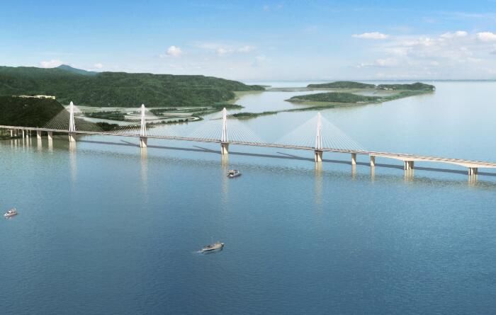 珠机城际金海特大桥起自珠海横琴新区,跨越西江磨刀门水道,终至珠海机场东路,是珠三角轨道交通网的重要组成部分,也是内地及珠三角地区联系香港澳门的重要客运通道。大桥首次采用多塔刚构体系公铁两用斜拉桥结构,主跨为3×340米的公铁同层四塔斜拉桥,全桥长1369米,宽49.6米,中间为双向160KM/小时的城际铁路,两侧为双向六车道的100KM/小时高速公路,是世界首座公铁同层多塔斜拉桥,也是目前世界上最宽公铁两用斜拉桥。