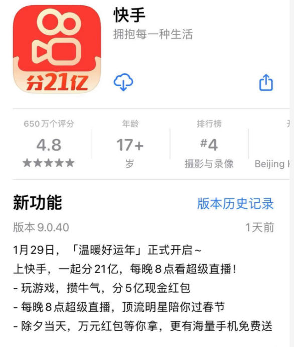 虽然距离除夕还有两周时间,快手已经更新了APP图标,“分21亿”的字样格外引人注目。“温暖好运年”预热场玩法于1月29日上线,新功能介绍中显示“玩游戏攒牛气,可分5亿现金红包”。此外,快手还将于除夕全天每60秒发百万个好运红包,最高可领一万元,还有海量手机免费送,要给快手用户带来一个热热闹闹、开心快乐的中国年。