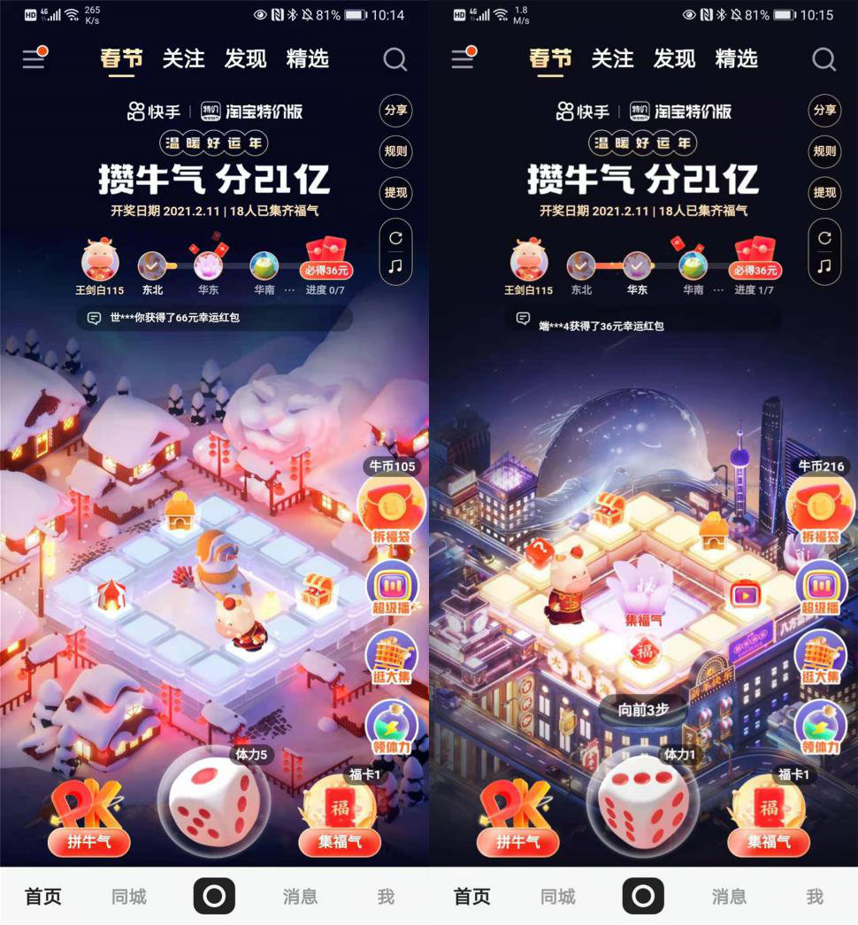 1月29日开始,用户在快手APP点击左上角“春节”按钮,或者侧边栏的“攒牛气分21亿”可以进入“温暖好运年”预热场会场。进入会场后用户要先从七种“福牛”的形象中选取自己的代言人,让它成为用户在游戏中的“旗子”,点击骰子小牛在棋盘上行进,行进过程中可收获多种福利。
