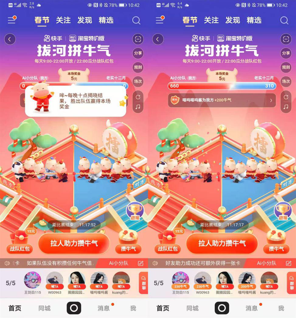 此外,用户还可以参与“拔河拼牛气”小游戏,该游戏页面设计的小牛精致可爱,动感十足。在游戏中,邀请好友组队或加入别人的战队,进行2~5人的拔河PK。只要在每天9:00-22:00的PK中,通过做任务或拉人助力,将自己的牛气值盖过对面就可以瓜分当天的奖金,最高可以达到1000元,累计最多可获得1653元。
