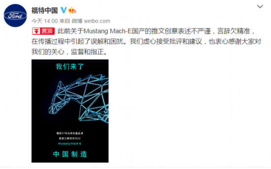 今天,@福特中国再次回应“错把牛年当马年”事件:此前关于Mustang Mach-E国产的推文创意表述不严谨,言辞欠精准,在传播过程中引起了误解和困扰。我们虚心接受批评和建议,也衷心感谢大家对我们的关心,监督和指正。