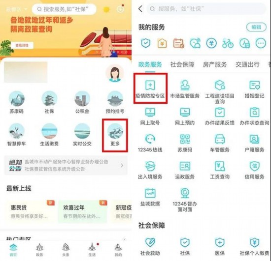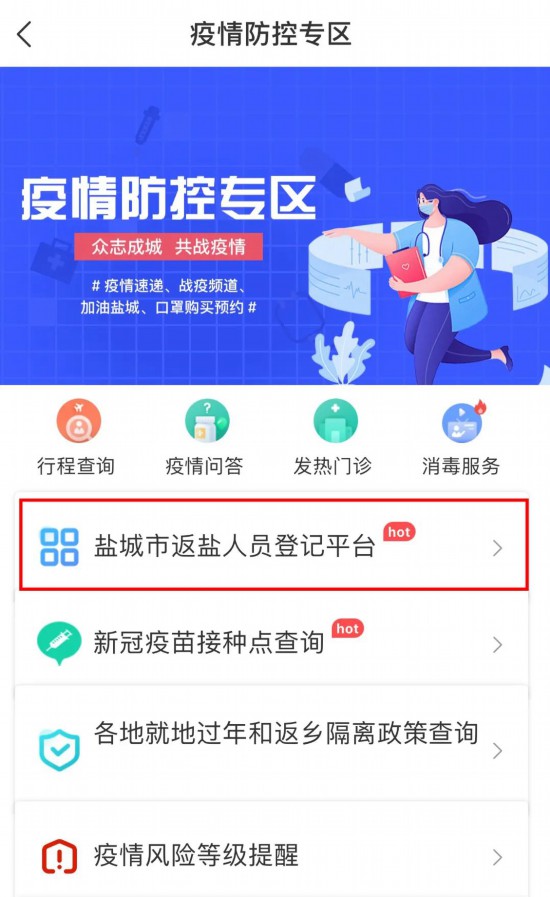 1、在“我的盐城”APP首页点击“更多”,进入“疫情防控专区”,找到“盐城市返盐人员登记平台”,点击进入。