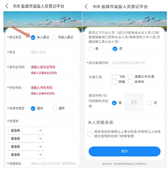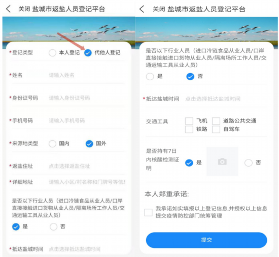 申请人详细填写“姓名”“身份证号码”“手机号码”“来源地信息”“返盐住址”“详细地址”“是否重点行业人员”“抵达盐城时间”“交通工具”以及“是否持有7天核酸检测证明”等信息,以便按照要求落实防疫属地管理。