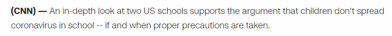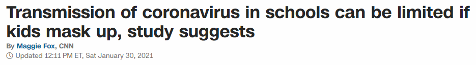 美国有线电视新闻网(CNN)援引一项针对美国两所独立学校的最新研究指出,如果采取适当的预防措施,孩子们就不会在学校里传播病毒。研究人员发现,在其中一所学校中,72%的在校传播病例都与不遵守学校的口罩政策有关。