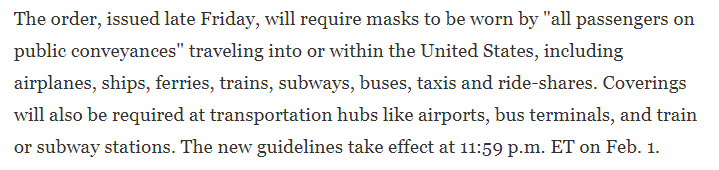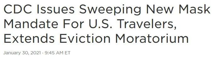 根据美国疾控中心(CDC)发布的指令,自当地时间2月1日“午夜前一分钟”(即2月1日23时59分)开始,全美范围内所有使用公共交通系统的乘客及相关工作人员必须佩戴口罩,违者可能面临刑事惩处。该指令没有规定具体有效期。