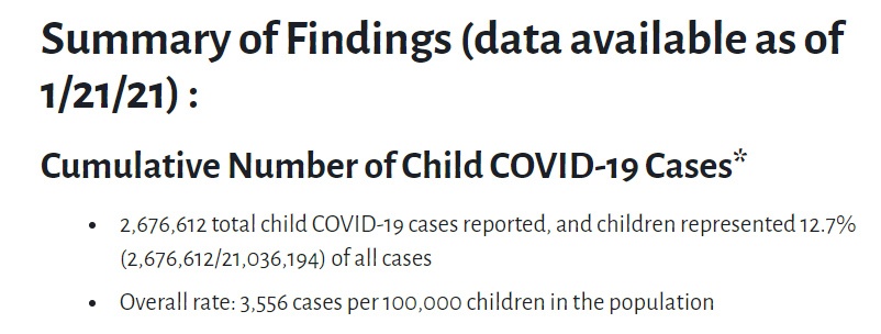 去年特朗普政府强推重启线下教学的做法使美国的校园成为疫情重灾区。美国儿科学会(AAP)最新的每周统计数据显示,截至1月21日,美国已有近268万名儿童确诊感染新冠肺炎,占全美病例总数的12.7%;每10万名儿童中确诊病例达3556例。