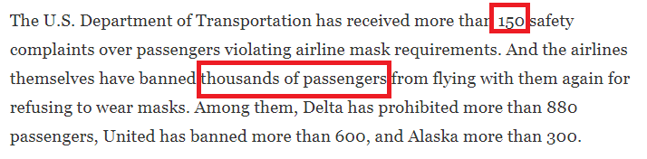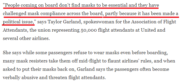 美国空乘协会(AFA)发言人泰勒·加兰表示,上飞机的人觉得戴口罩没有必要,部分原因是这已成为一个“政治问题”。甚至有抵制戴口罩的乘客在飞行途中故意摘下口罩,炫耀式地对抗航空公司规定;而当被要求戴上口罩时,他们还会辱骂并威胁空乘人员。