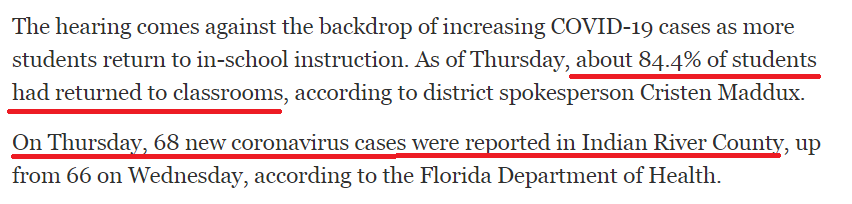 无论这些家长的主观意愿如何,不戴口罩的后果肯定要由孩子们承担。据印第安河县学区发言人克里斯汀·马达克斯说,截至听证会举行前一天,当地约84.4%的学生已经返回教室;而佛罗里达州卫生部的数据显示,当天印第安河县报告了68例新冠肺炎确诊病例,高于前一天的66例。