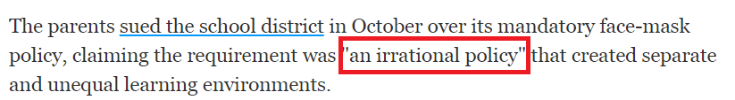 这起诉讼并不是该地区的口罩政策第一次受到挑战。去年10月,这些家长就起诉了所在学区强制佩戴口罩的政策,称这项“不合理政策”造成了隔离和不平等的学习环境。一些家长甚至声称,要求佩戴口罩侵犯公民自由。