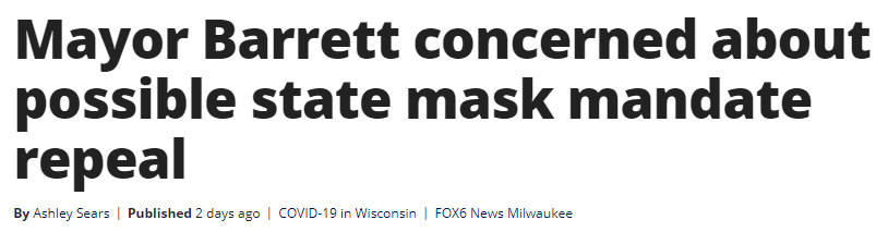 威斯康星州最大城市密尔沃基市市长汤姆·巴雷特警告说,废除全州口罩令可能会对公共卫生造成灾难性影响,议员们必须停止玩弄党派游戏,“这是一场现在不应该发生的斗争,但议员们正在打拳击”。