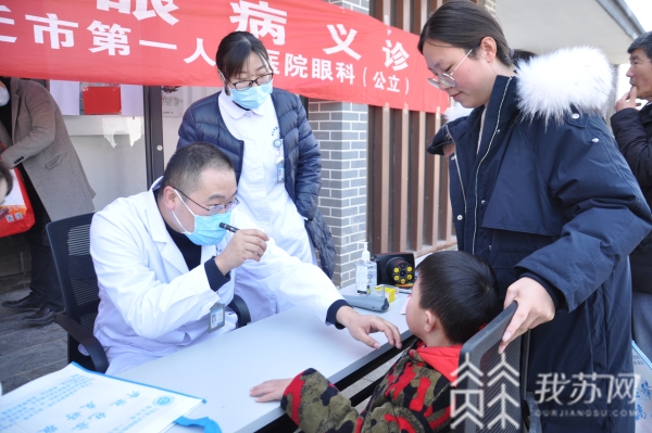 在振友社区卫生室门口,宿迁市第一人民医院的医护人员在这里设置了义诊台,为老百姓免费测量血压、血糖,还为大家做眼科检查,并宣传眼科保健知识。