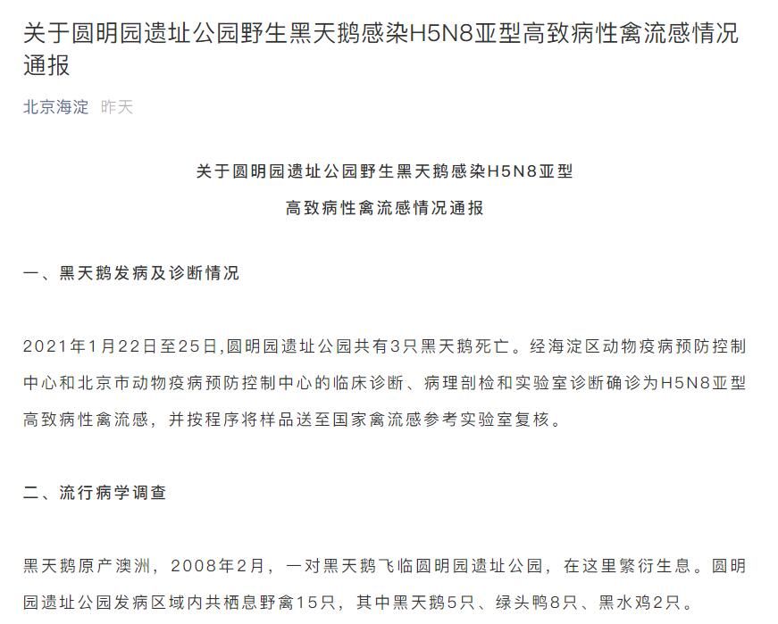 北京市海淀区融媒体中心微信公众号“北京海淀”2月1日发布“关于圆明园遗址公园野生黑天鹅感染H5N8亚型高致病性禽流感情况通报”。2021年1月22日至25日,圆明园遗址公园共有3只黑天鹅死亡。经诊断、病理剖检和实验室诊断确诊为H5N8亚型高致病性禽流感。疫情发生后,海淀区防治重大动物疫病指挥部办公室立即启动应急响应机制。截至目前,未发现异常情况,且已有效控制,其它地区均未见感染。详情》