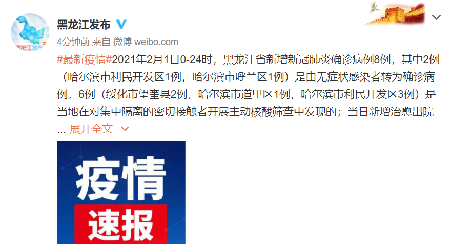 荔枝新闻讯 据黑龙江省卫健委消息,2021年2月1日0—24时,黑龙江省新增新冠肺炎确诊病例8例,其中2例(哈尔滨市利民开发区1例,哈尔滨市呼兰区1例)是由无症状感染者转为确诊病例,6例(绥化市望奎县2例,哈尔滨市道里区1例,哈尔滨市利民开发区3例)是当地在对集中隔离的密切接触者开展主动核酸筛查中发现的;当日新增治愈出院确诊病例1例(绥化市望奎县)。当日新增无症状感染者4例(绥化市望奎县1例,哈尔滨市呼兰区1例,哈尔滨市利民开发区2例),均是当地在对集中隔离的密切接触者开展主动核酸筛查中发现的;当日解除无症状感染者医学观察4例(绥化市望奎县)。