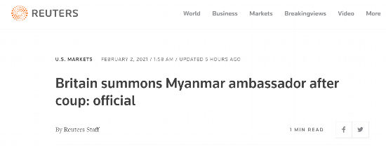 路透社消息,在英国首相约翰逊发声谴责缅甸军方发动“政变”后,英国外交部一位官员透露,当地时间2月1日,英国召见了缅甸驻英大使。