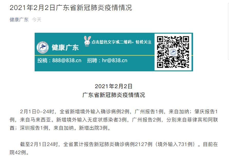 荔枝新闻讯 广东省卫生健康委员会微信公众号2月2日发布“2021年2月2日广东省新冠肺炎疫情情况”,2月1日0-24时,广东省新增境外输入确诊病例2例,广州报告1例,来自加纳;肇庆报告1例,来自马来西亚。新增境外输入无症状感染者3例,广州报告2例,分别来自菲律宾和阿联酋;深圳报告1例,来自加纳。新增出院3例。