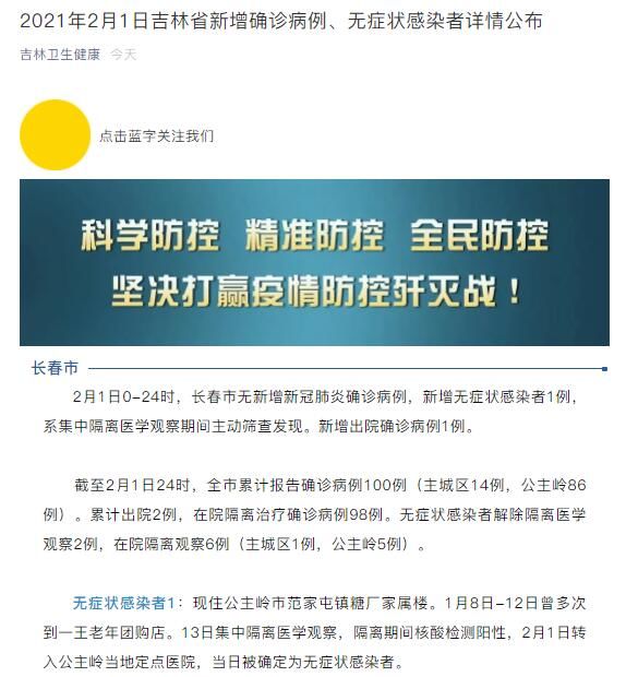 荔枝新闻讯 吉林省卫生健康委员会微信公众号2月2日公布“2021年2月1日吉林省新增确诊病例、无症状感染者详情”消息: