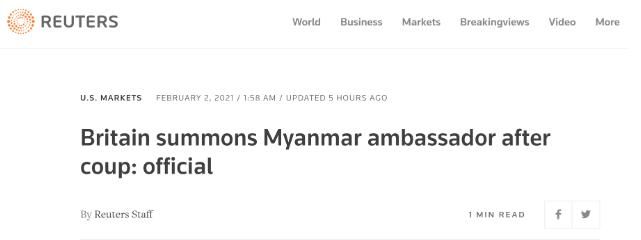 路透社消息,在英国首相约翰逊发声谴责缅甸军方发动“政变”后,英国外交部一位官员透露,当地时间2月1日,英国召见了缅甸驻英大使。