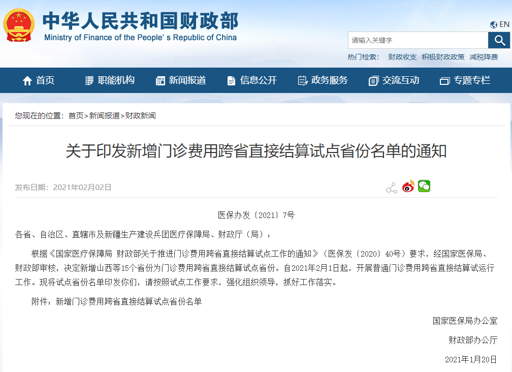 荔枝新闻讯 据财政部网站消息,近日,国家医保局办公室、财政部办公厅联合发布《关于印发新增门诊费用跨省直接结算试点省份名单的通知》,根据《国家医疗保障局 财政部关于推进门诊费用跨省直接结算试点工作的通知》要求,经国家医保局、财政部审核,决定新增山西等15个省份为门诊费用跨省直接结算试点省份。自2021年2月1日起,开展普通门诊费用跨省直接结算试运行工作。