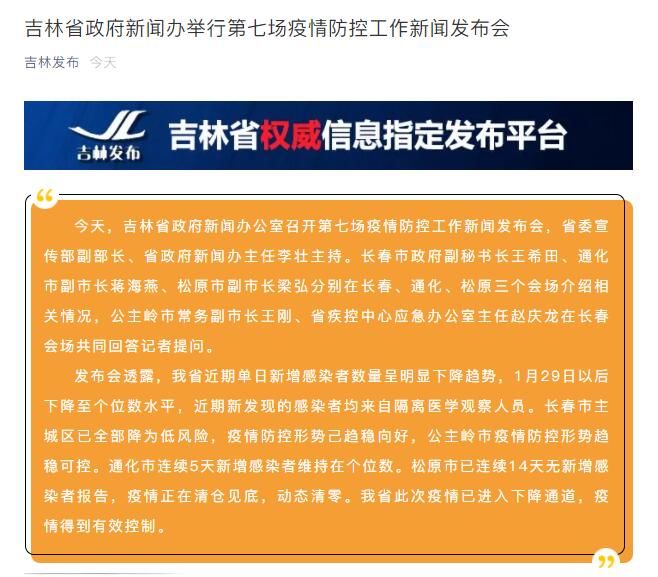 荔枝新闻讯 据吉林省人民政府新闻办公室微信公众号“吉林发布”消息,2月2日,吉林省召开第七场疫情防控工作新闻发布会。省疾控中心应急办公室主任赵庆龙介绍,吉林省近期单日新增感染者数量呈明显下降趋势,1月29日以后下降至个位数水平,近期新发现的感染者均来自隔离医学观察人员。长春市主城区已全部降为低风险,疫情防控形势己趋稳向好,公主岭市疫情防控形势趋稳可控。通化市连续5天新增感染者维持在个位数。松原市已连续14天无新增感染者报告,疫情正在清仓见底,动态清零。吉林省此次疫情已进入下降通道,疫情得到有效控制。